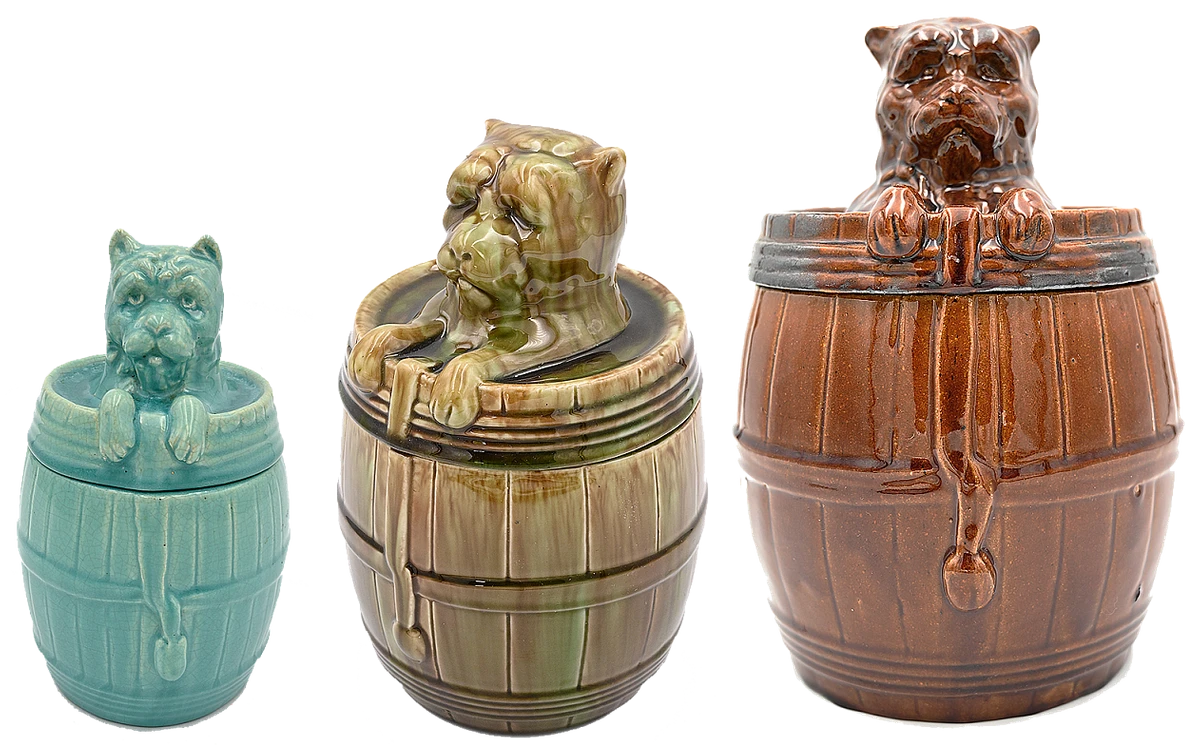 Het model tabakspot “Hond in een regenton” werd in grote aantallen en in 3 verschillende maten gemaakt.